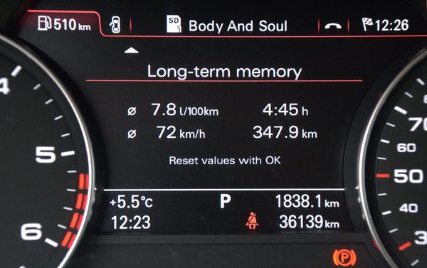 Elindultam, mentem, sokat, kifelé az országból, át a másikba, onnan a harmadikba, a nyolcsebességes automata hamar felváltott és lényegében 7-8. fokozatban utaztunk végig. Nyolcliteres átlagfogyasztással hagytam el Budapestet, Tatánál már 7,8-ra esett vissza, aztán sok-sok kilométerrel távolabb, meglehetősen dinamikus haladás mellett 7,7 (na nee), majd 7,6 (ez hülye), végül 7,5 literen állt meg, a nálam töltött idő alatt a vegyes fogyasztás 7,8 liter lett. Egy 313 lóerős, 1765 kilós, automata, összkerekes, ötméteres limuzintól ez egyáltalán nem rossz, sőt.