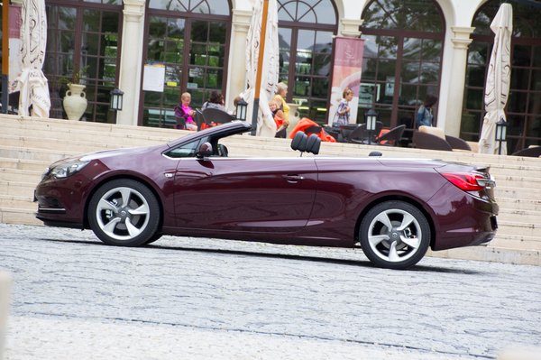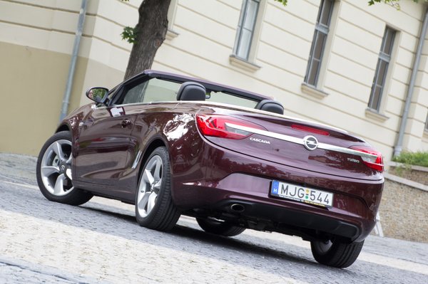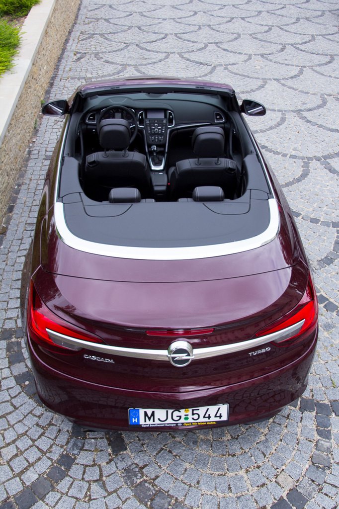 A képzeletbeli szélvédő- és övvonal szinte párhuzamosan futnak és magasodnak az ég felé, az orra pedig lejt, és a lámpatestekből induló mélyedés ügyesen takarja a tényt, hogy a valóságban ez is a gyalogosvédő, magas fajta. A leginkább ügyes megoldás pedig talán annak köszönhető, hogy az Opel nem állt be a sorba, és csinált béna, keménytetős autót, hanem vászontetővel szereli a Cascadát. Ennek köszönhetően a hátsó kerékjárati ív fölött nem éktelenkedik a bonyolult mechanizmust és magát a tetőt takaró dobozszerű felépítmény, ami olyan farnehézzé tesz minden keménytetős kabriót, mint Falusi Mariannt a menyasszonyi uszály.