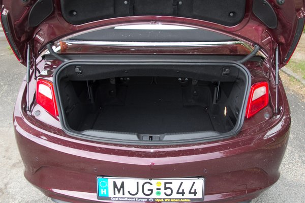Ha négyesben utazunk, mindez természetesen nem érvényes. Mert bizony lehet, az Opel valahogy megcsinálta, hogy hátra – kisebb-nagyobb kompromiszumok árán ugyan –, de beférjen két átlagos méretű felnőtt. Tudjuk, mert kipróbáltuk és utaztunk is így, hosszú távon persze elviselhetetlen hátul az orkán, de a gyerekeket hozni-vinni az óvodából tökéletesen megfelelő. Kábé kilencvenes tempó az, ami még elviselhető így hátul. A vászontető ötvenes tempóig fel- és lehúzható, így lakott területen belül akár az egész napot végigdemózhatjuk, a Cascada felhúzott tetővel sem ronda.