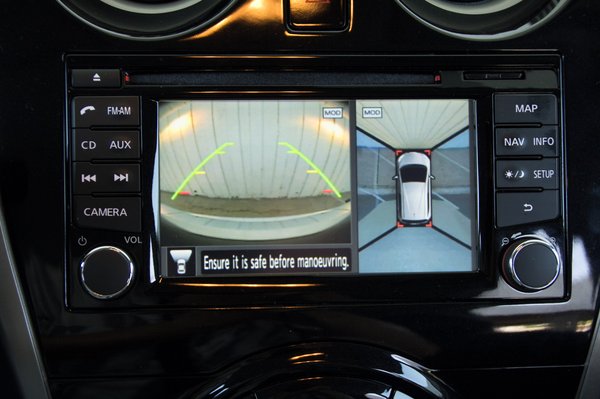 Az autó körüli mozgásra lassú manőverezésnél, rükvercben, vagy ha külön bekapcsoljuk, egyesben figyelmeztet az autó. Itt arra kell gondolni, hogy egy kölyök mögénk biciklizik, és nem vesszük észre, amíg ránk nem csipog a Note. Aranyos figyelmesség, és ha csak egyetlen gyerek életét menti meg, máris megérte a rafinált programozás. De a rendszer igazán életminőség-fokozó hozománya az autót felülnézetben ábrázoló négykamerás parkolássegítő. Elég jó a képe ahhoz, hogy hátranézés nélkül centire pontosan tudjunk manőverezni az autóval, így aztán bármilyen be- és kiparkolás gyerekjáték.