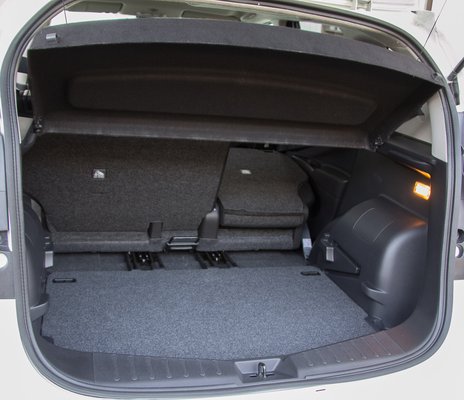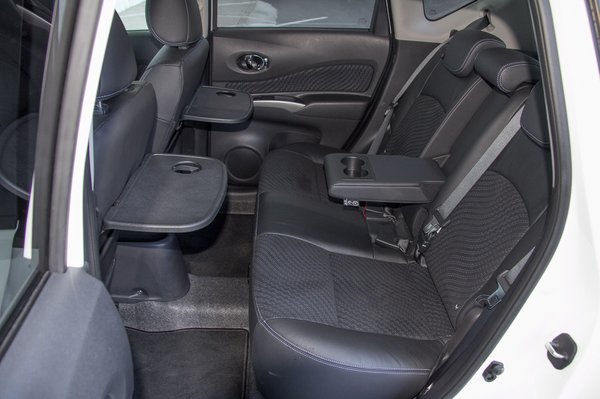 Ellenben a lábtér. Most jön a lényeg. Az bizony akkora, mint egy 7-es BMW-ben. És ez nem túlzás, a Nissannál nyilván megmérték colstokkal, és tényleg hihetetlen, milyen láblógatós tér keletkezett az első ülések mögött. A jobban felszerelt Note-okban, ahol már tologatható a hátsó ülés, a lábtér kárára bátran előrébb húzhatjuk a padot, és így az alapból is tisztességes 300 liter körüli csomagtartót tovább lehet növeszteni. Ha még a háttámla szöge is állítható lenne, és nem kellene karót nyelt pozitúrát felvennünk, valóban fejedelmi lenne a hátsó sor. Könyöklő, lehajtható tálca, minden van, ami kell, és a legjobb, hogy a hátsó ajtó egészen szokatlanul nagy szögben nyílik, így elegánsan lehet beszállni vagy a gyereket bekötni az ülésben. Elfeledett erény ez, de oltári praktikus.