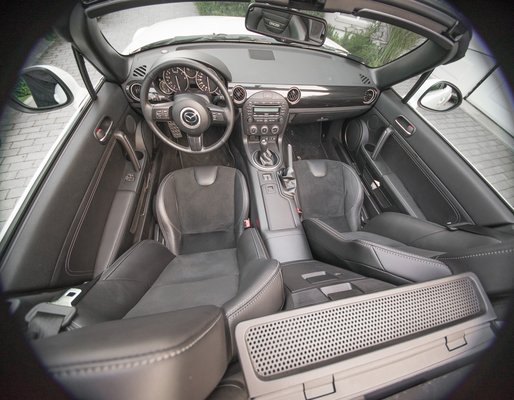 Számomra egy dolog volt meglepő: mennyire korszerűtlen az MX-5 belseje. Tulajdonképpen már akkor is az volt, amikor kihozták az NC-t – a Mazda amúgy sem az érdekes, nagyon kitalált belterek mestere, én legalábbis még a vadonatúj 6-os műszerfalára is csak megvonom a vállam. Az NC-ben sem navi, sem egyéb érintőképernyő, sem egyéb érdekes dolog – nem hiányoznának a már Opel Astra-szinten is megszokott vezetőtámogató rendszerek, csak mára annyira elharapódzottak az elektronikai extrák, hogy az ember először csodálkozva keresgéli őket, főleg egy 8,5 milliós autóban. De azt mondom, ha direkt volt, a Mazda egy zseni, és tartsa is meg a jó szokását. Ha ez maradna az MX-5 imidzse, hogy egy puritán roadster kézi tetővel, klímával és jelzésértékű hifivel, én nagyon támogatnám. Esetleg egy nem túl nagy képernyős navit belevarázsolnék, de más tényleg semmit. Na jó, egy üléshűtést.