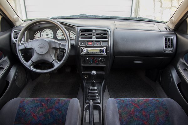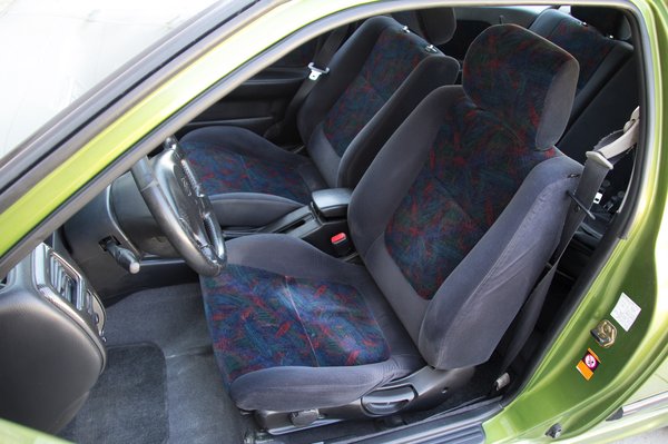 Mondanám, hogy a dögunalmas külső után felüdülés beleülni, de a beltér is legfeljebb retrónak megy el. A firkamintás kárpit 99-ben, amikor ez az almazöld példány gazdára talált, talán fiatalosnak számított, de nem tudom elképzelni, hogy a légbeömlők körüli karbonutánzat valaha is menő lett volna. A fehér hátlapú műszerek gyárinak tűnnek, ezt nyilván sportosnak gondolták. Ó, a jó japánok, milyen csodákkal ajándékoztak meg minket, és néha mennyire mellényúltak.