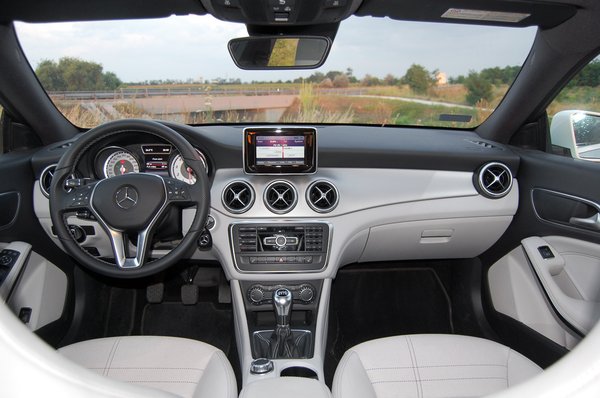 Az ülések is pontosan azonosak a korábban már megénekelt A osztály üléseivel, a beltér is nagyon hasonló, mégis más. Abban más, hogy a kevés olcsó műanyagot a CLA-ban már szinte teljesen kiszorította a finomabb tapintású műanyag, a műszerfal közéső kijelzője már nem az olcsóbb VFD (vákuum fluorszcens kijelző), hanem az igényesebb, TFT folyadékkristályos panel. Ne haljunk bele az örömbe, az Audi már ilyet használt az A4-esben 2004-ben is, majdnem tíz éve. Viszont a magyar CLA szépen össze van szerelve, nem zörög, nem lötyög, nem nyiszog. Csak a középképernyő remeg és zizeg, de az a kínai tablet-szerű panel annyira szánalmas ezekben az autókban, hogy szinte kínos is róla írni.