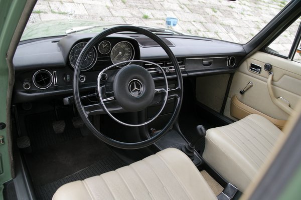 Már ránézésre süt a W115-ösről az archaizmus. Az ábrázatát uraló króm hűtőrács, ami ráadásul a motorháztetővel együtt nyílik, sokkal öregebbnek láttatja kihívóinál. Ha BMW-t tesszük mellé, nagyapja lehetne, ami nagyjából stimmel is, hiszen a Mercedest már 67-ben bemutatták, míg az 5-öst csak négy évvel később - egyébként mindkettő formájáért a francia Paul Bracq felelt. De a vele egyívású 504-es is sokkal fiatalosabbnak hat, mint a Fecske utáni, öreguras tekintetű állólámpa - naja, Pininfarináék már akkor is a jövőbe láttak.