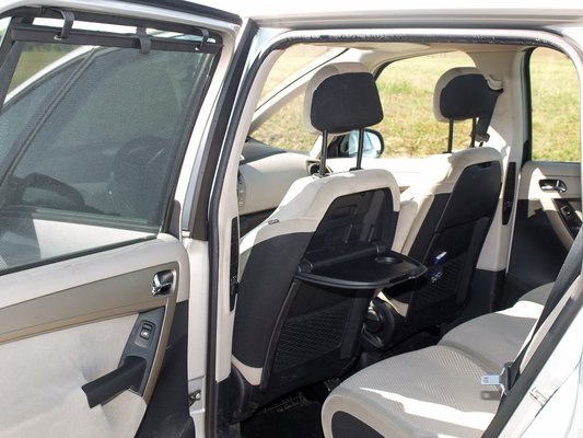 Összességében minden funkciója működik, sehonnan sem halottam műanyag zörgését csak a vezető előtt lévő hatalmas rekesz emelőmechanikája fáradt el. Még a szuperérzékeny árnyékoló rolók, és a kalaptartó is szinte új, persze vigyáznak is rá. A két szükségülés, ugyan nem a business class, de könnyen előránthatóak és egy rövidebb útra tökéletesen megfelelnek. Az előd Xsara Picassóból átmentett tálcák is jól jöhetnek a hosszabb utakon, pár legó vagy szendvics simán elfér. Az sem okoz problémát, ha kisbaba van hátul, a szellőztetést csökkenthetjük neki megfelelően, sőt ha apu huzatnáci, akkor akár plusz ventillációt is kérhet a középső sor.