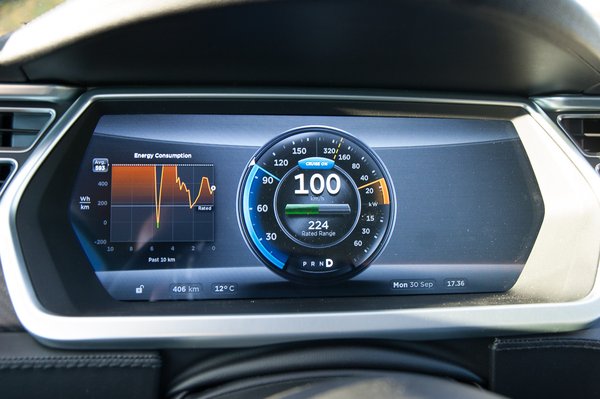 És az is csodás, hogy milyen selymesen gyorsul – bármilyen sebességről bármilyen sebességre. Sem a száguldás, sem a suhanás, sem a tötymörgés nem stresszes az autóval, bármilyen sebességen otthonosan és erőlködés nélkül mozog. Az elektromos autóknak általában inkább a fékjük pocsék, elsősorban azért, mert nem lineáris. A Model S szinte teljesen mentes az ilyen kellemetlenségtől, csak vészfékezésnél tapasztalni egyfajta brutális lassítóerő-növekedést. Ilyenkor, és csak ilyenkor előjön a gépészet bugyraiból a villamoshang is.