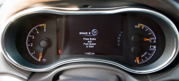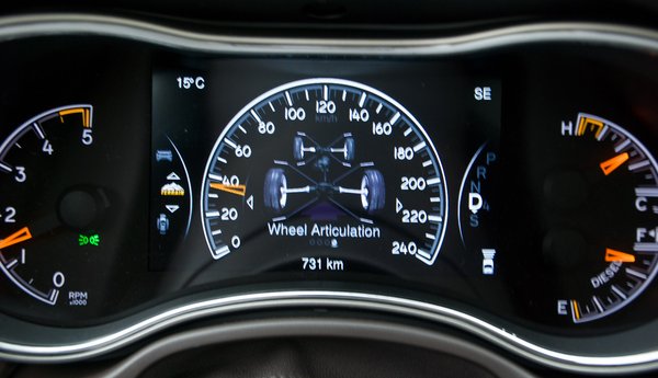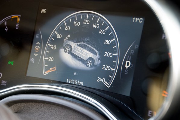 Itt található a Select-Terrain rendszer választótárcsája. Ez összesen 12 szenzor adatait gyűjti be és dönti el, hogy éppen hol és milyen felületen haladunk. Automata állásban teljesen jól működik, de ha kedvünk tartja, felülírhatjuk. Ilyenkor az óracsoport közepén stílusosan egy havas dombra felkaptató, sáros vagy sziklamászó Grand Cherokee-animáció tűnik fel. Igen.
