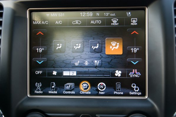 Az óracsoport önmagában egy 7 colos TFT-kijelző, amit természetesen kedvünkre konfigurálhatunk, összesen több, mint száz különböző infót hívhatunk le rá a nagyonmulti-kormánnyal. Középen a UConnect-rendszer 8,4 colos képernyőjét találjuk. Ez meglepően használhatónak bizonyult, fényévekkel jobb, mint a Lexus egeres-kurzoros megoldása de kevésbé áttekinthető és gyors, mint egy Audi-féle MMI. Azok, akik ültek már új Range Roverben egyértelműen állítják, hogy sokkal használhatóbb attól is.