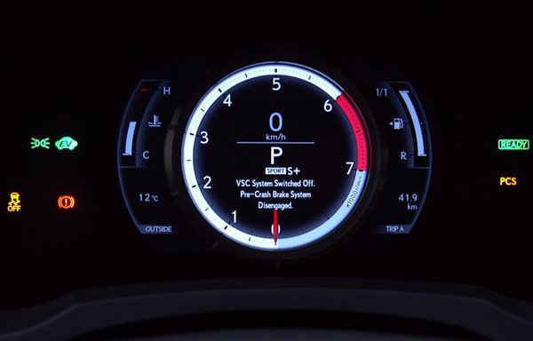 A csomagtérre sem lesz panasz. 450 literes, az akkumulátorcsomag fektetve van beépítve, így bővíteni is lehet, de – természetesen – csak a támlát tudjuk dönteni, az ülőlapokat nem. Tesztautónk ötmilliós extracsomagot kapott, így elsőre riasztó mennyiségű a funkció- és a személyre szabható lehetőség. Szeretem a kütyüket, így természetesen imádtam az LFA-ból ismert, oldalra elcsúszó körműszert, ami az egyetlen, klasszikus fordulatszámmérőre emlékeztető dolog a műszerfalon. Villanymotor húzza oldalra finoman zümmögve. Persze ez is teljesen LCD, a számok és a mutató színe is variálható, ha netán szükségét érezné, hogy pirosról kékre váltson.
