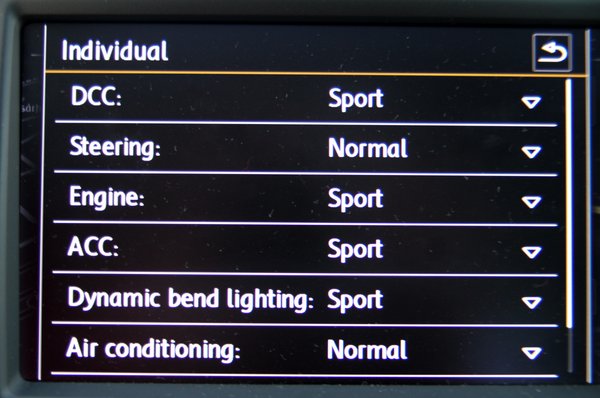 Az adaptív futóművel egyetemben több – elődefiniált – profil közül választhatunk. Akad komfort-fokozat, normál-mód és persze sportos is, valamint egy negyedik, ahol mi magunk konfigurálhatjuk a változókat (gázpedál-reakció, váltó karakterisztika, kormányrásegítés stb.).