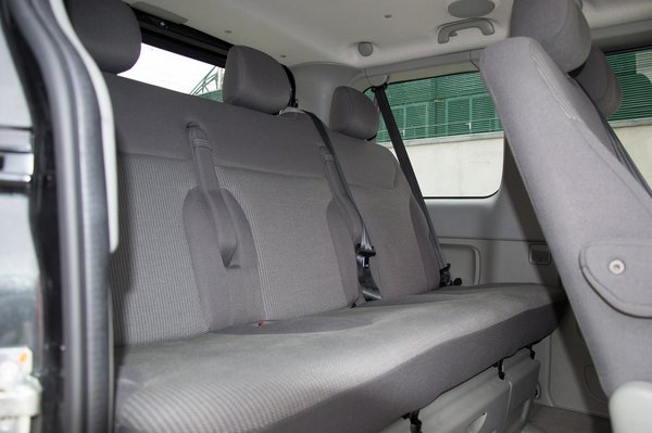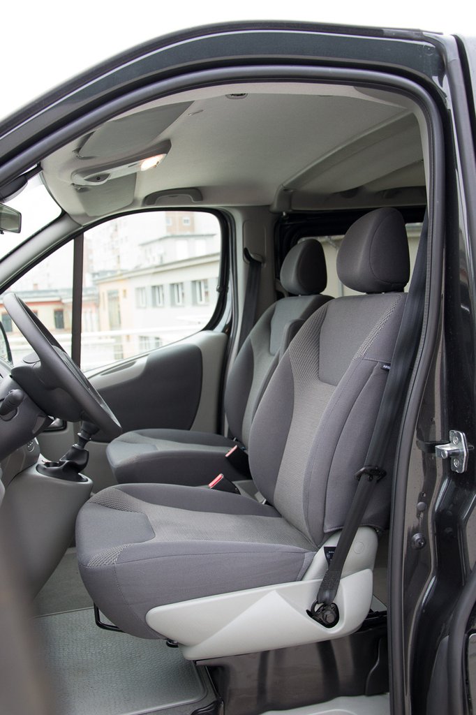 A Vivaróból hétszemélyes változatot kaptunk: elöl két ülés, középen egy kétszemélyes, hátul egy háromszemélyes pad. Az első két ülés közötti átjáró az egyik legjobb dolog az ilyen buszokban, nem csak az átjárás lehetősége miatt, megnöveli a tér érzetét az elöl és hátul ülőknek is, és valljuk be büntetés a sebváltónál középen ülni. Az első két fűtött szövet ülés, kényelmes, süppedős fotel inkább, kartámasszal, magas, de személyautós pozícióval. Nem próbáltam ilyen hosszú távon, de valahogy úgy képzelem el, hogy elgémberedés nélkül lehet kiszállni belőle egy Budapest-Barcelona táv után is.