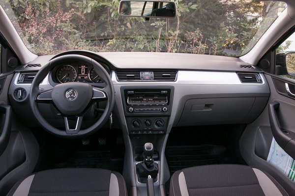 Belül egyébként tényleg tök olyan a Spaceback, mint a sima Rapid, ha az ember nem a kormányküllőket számolgatja. A műanyagok mindenhol kemények, de nem gusztustalanok, szép a felszínük. Igaz, a hasonló méretű autók köréből lefelé lóg ki anyagminőség terén, de látványra nem zavaró. A klíma manuális, érezni, ahogy a tekerentyűk a laza bovdeneket huzigálják, azért ez a minőségérzet nem egy VW-é. Erre azt mondja egy Simply Clever škodás, hogy: na és? A célnak megfelel. És igaza van.