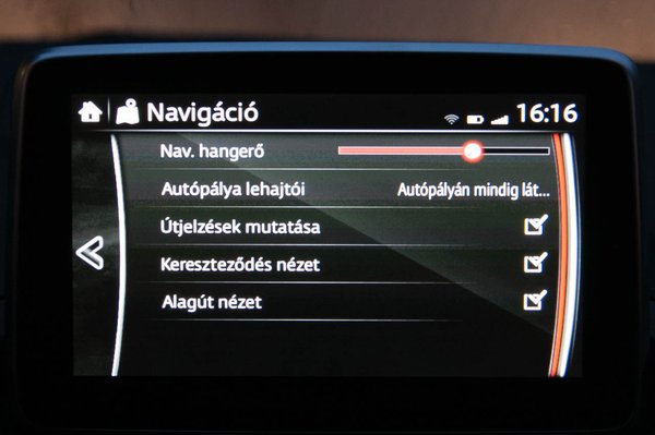 Vicces látni, ahogy a tömeggyártók ma pontosan ugyanazt a szívást csinálják végig, amit a BMW az iDrive-tekerőgombos kezelés bevezetésekor, úgy tizenegy-két éve. Tény, hogy a mobilok évente generációs ugrást hajtanak végre, ami az autóiparban tarthatatlan. Ettől függetlenül legalább egy alap kínai mobil szintjét kéne tudni, zenelejátszásban, névjegyzékkezelésben (pár érdekes képernyőt beválogattam a galériába). Különben mi lesz öt év múlva? A félrecsúszott fordításokat a teszt óta már kifrissítették a Mazdából, de ez önmagában kevés. A nagyképernyős rendszerben tényleg csak egy igazán jó dolog van, a navigáció, egyszerűen azért, mert Igo-alapú.