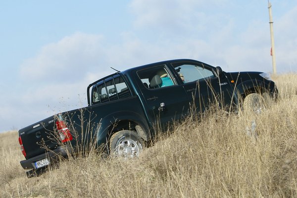 Terepen nem mozgott rosszul, de fölöslegesen kemény futóműve miatt a kelleténél jobban elpattog, a kerekeknek nem sikerül mindig talajt fogni, a kellően nyomatékos motornak és a jó kiosztású, ötsebességes váltónak hála könnyedén elővarázsolunk annyi erőt, amennyivel megoldunk minden feladatot. Terepjárás előtt azonban kapcsoljunk hátsó difizárat, mert nélküle átlóban bizony megáll a Hilux tudománya. Ott lesz a gomb, a bal térdünk tökéletesen takarja, érdemes megjegyezni a helyét. A lejtőn tolatva elindulást megcsinálta ugyan, de az első hajtás egy picivel később kapcsolt, mint kellett volna, a kerekek pedig komoly kipörgéssel dolgoztak, a hátsó tengely szlipje jelentős volt még földes talajon is.