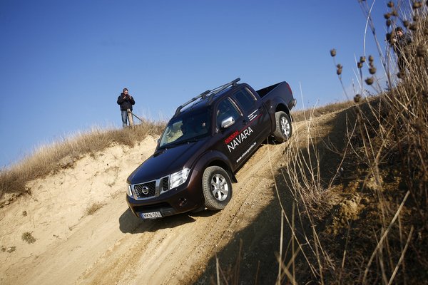 A már említett nagy tengelytáv és a kis híján 190 centiméteres szélesség, valamint az 5,4 méteres hossz és a 13,3 méteres fordulókör terepen eléggé behatárolják az autó mozgásterét, ha szívbajosak vagyunk. A nagy test könnyedén begyűjti a karcokat és a 18,5 fokos hátsó terepszög, valamint a 2 tonnás önsúly, és az irgalmatlanul pattogó, bután rázó, rövid rugóutakkal dolgozó futómű azt eredményezik, hogy a Navara inkább áttúrja magát az akadályokon, mint egy gigantikus troll, amelyik még meg is tapossa az útjába kerülő szerencsétlent.