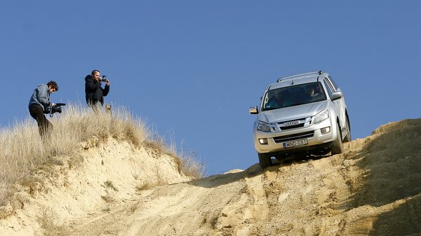 A D-Max lett a kellemes meglepetés, tesztünk sötét lova. Egyedül két zavaró dolog merült fel vele kapcsolatban, de egyik sem befolyásolja jelentősen a használhatóságot. Az első, hogy gyorsításkor a motor zajos és csörömpöl, a másik, hogy a puha futómű miatt hullámos terepen annyira képes belengeni az eleje, hogy keményen felüt. Ilyenkor annyit kell tenni, hogy lassítunk, nincs vész. A díszkivitel hátsó túlnyúlására érdemes odafigyelni, a terepszög átlagos 23 fok, de a műanyag sarokdíszt gond nélkül elhagytuk az első bucka alján.