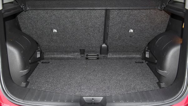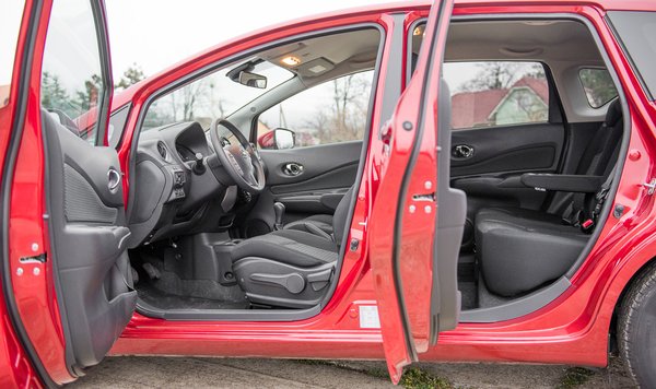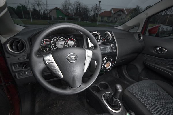 Az új Note nem lett lényegesen nagyobb, mint az elődje, az egyetlen lényeges változás, hogy három centivel alacsonyabb. Sose gondoltam volna – kényelmes beülni, kiszállni és utazni, akár elöl, akár hátul, fej, láb, könyök, minden alkatrészünk elfér. A középső tetőoszloptól hátrafelé eléggé elbunkeresedik, de előre jól ki lehet látni. Az első tetőoszlopok valószínűleg az alsó kisablak kerete miatt tudnak ilyen – viszonylag – vékonyak lenni. A megoldás ráadásul a nagyobb testű autókból ismerős, így talán a Note-ban is könnyebben érezzük úgy, mintha komolyabb egyterűben ülnénk. Emellett csomagtartó is maradt, a 325 liter a kisautók között elmegy, ha viszont előbbre toljuk a hátsó ülést 411 litert kapunk. Az ajtók majdnem derékszögig nyithatók, a csomagtérajtó könnyen nyílik fel – a Note a méretéhez képest könnyű, alig több mint egy tonna (1036 kg), de egyáltalán nem tűnik hitványnak.
