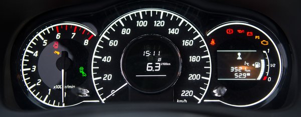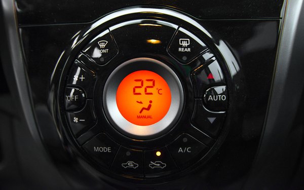 Ha bekapcsoljuk az ECO gombot, a műszerfal kerete türkizes derengésbe kezd. Van, aki szerint ECO módban nem megy a kompresszor – hosszasan próbálgattam, de szerintem nem kapcsolja le. A gyorsulás ugyanolyan marad, és a Nissan nem is a szellőzéssel spórol ilyenkor, mint sokan mások - egyszerűen csak kékesen dereng a műszerfal kerete, és ennyi. Mint a régi Trabant econométer: jelzi, hogy épp tövig, vagy csak félig nyomjuk a gázpedált.