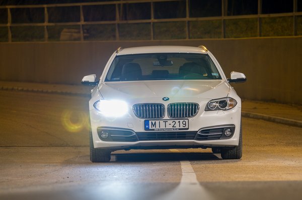 Ha esetleg csodálkoznak, hogyan sikerült féloldalasan világító lámpával lefényképezni az 5-öst, segítek. Pont a fotózás közben, amikor pár centit vagy fokot igazítani akartam az autón, egy indításkor elkezdett bimmbammolni, és kiírta, hogy nem működik az adaptív világítás. Talán szégyellős lett. Innentől mindenesetre nem akarta már felgyújtani a bal oldali helyzetjelzőt, és valóban nem variálta a fényszórót sem: bután, laposan maga elé világított – sokkal rosszabb volt, mint bármilyen fixre állított lámpa, nem mertem nyolcvannál gyorsabban menni. Még idegörlőbb volt, hogy minden indításnál sípolt, és a középső kijelző is mindig a hibaüzenetre állt vissza. Aztán a teszthét végén minden további beavatkozás nélkül egyszer csak megjavult. Nem nagy ügy, csak azon gondolkodtam el, hogy mi lenne, ha ez a garancia lejárta után történne és enyém lenne az autó.