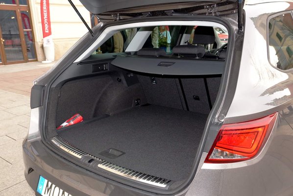 Mert az. Összesen 27 centivel toldották meg az ötajtóst, hogy kombi lehessen, de addig izzadtak a szélcsatornában, amíg sikerült ugyanolyan légellenállási alaktényezőt kicsiholni az ilyen szempontból kevésbé előnyös kombi karosszériából. Talán ettől lett picit csapottabb és ezért hiányzik az a kis hátizsáknyi térfogat a raktérből, ami az Octaviában megvan. Van viszont alacsonyabbra vagy magasabbra helyezhető raktérpadló, pöccintésre előrecsúszó roló, sőt, van karakuri ülésdöntés is, amit a Mazda vezetett be, majd felejtett ki az autóiból. Arról van szó, hogy a csomagtartóban lévő kallantyú nem csak a háttámla zárját oldja, hanem az ülés magától előre is dől. Pontosabban nem magától, hanem a benne lévő rugótól. Végül is mindegy mitől, de bajlódás nélkül lehet átrendezni, az ülőlapok felhajtogatásával sem kell vesződni. A hátsó pad előrehajtogatásával úgy 1470 liter a maximális raktérméret. Mit kell ezen felül tudnia még egy kombinak? Ezen felül ugyanazt, amit az ötajtósnak. Normális minőségű utasteret, rendes formájú üléseket és elég helyet hátul – ezekkel már a sima Leon esetében sincs gond. Mert egy jó autó nagy csomagtartóval is jó autó marad.