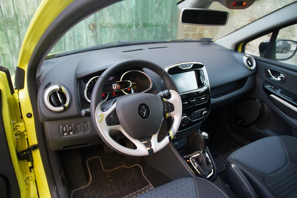 Az érintőképernyős multimédiás R-link rendszer egy picit akadozik és kétszer le is fagyott. Az egyik alkalom sajnos akkor történt, amikor valakinek meg szerettem volna mutatni, hogy az R-sound egység még űrhajó hangot is tud utánozni az autó belterében, milyen jól lehet szórakozni ezzel. Ekkor beakadt a rendszer maximális hangerőn űrhajóban. Ha próbáltam kikapcsolni, akkor az „Ön autójában ez a funkció nem elérhető” tájékoztató szöveget kaptam. Csomókban kezdett hullani a hajam az űrhajó visítástól és csipogástól, úgyhogy megálltam, leállítottam, kivettem a kulcs nélküli indítás kártyáját a tartójából, elmondtam egy rövid fohászt és újraindítás után megjavult a rendszer. Kis dolgoknak is nagyon lehet örülni, a Clio megtanít erre is. Tudják, egyéniség. A rendszer első hallásra hülyeségnek tűnik, és az is valójában, de profi módon van megcsinálva. Többféle hangot bekapcsolhatunk, ami a jármű hangszóróiból szól, de fordulatszám és gázpedál állás, tehát terhelés arányosan, akár zene vagy a telefonálás alatt is. A hangerejét jól beállítva simán elhisszük, hogy egy V6-os motor hubog elöl, jó szórakozás.