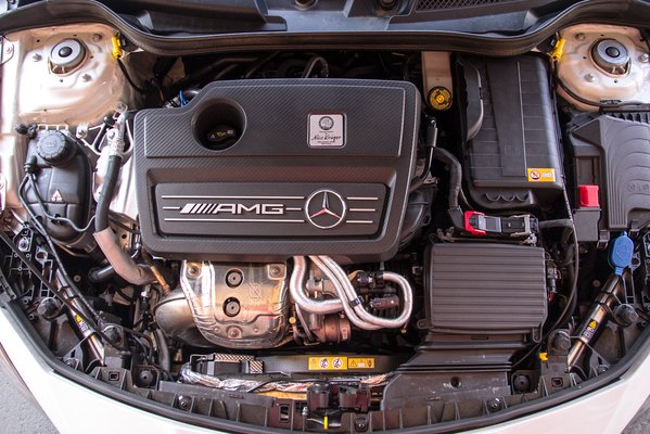 Ez a motor jelenleg a legnagyobb literteljesítményű sorozatban gyártott motor, két literes és 360 lóerős, tehát 180 LE a literteljesítménye. Ehhez nem elég rádobni egy turbót valamilyen motorra, ehhez már okosan kell egy motort építeni, a cél ismeretében. A kettős megfúvású Borg Warner turbó majdnem két barral tölt, a dugattyúk kovácsolt alumíniumból vannak, és különleges, a Mercedes által szabadalmaztatott felületű hengerekben siklanak. A töltőlevegő-hűtő vizes, a blokknak elektronikusan szabályozott olajhűtője, és szabályozott vízhűtése van. Az összes cső a motortérben AMG feliratos szilikoncső, gondoltak rá, hogy ez majd néha kap egy kis pályanapot, vagy kemény hajtást autópályán.