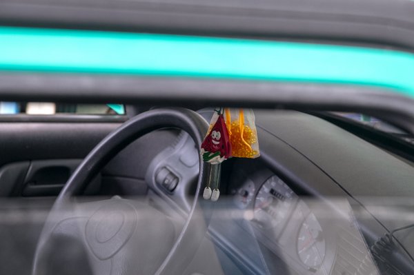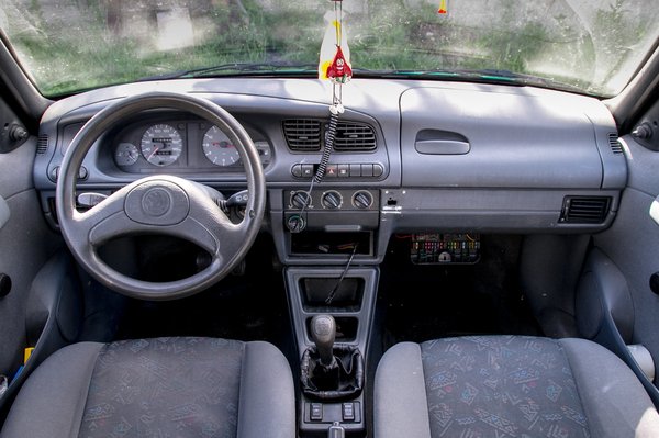 Az autó két évig állt egy udvaron, félig letekert ablakkal. Az elsők villanyosak, biztosan lemerült az akkumulátor és úgy hagyták, próbáljuk megfejteni a korábbi tulajdonos logikáját. Az eső, a hó és a hő megette a beltér ehető részét. A váltógomb porhanyós, amikor megnyomkodom, gyönyörűen szétnyílnak rajta a barázdák. A kormány is formálható, az utastér többi részét tartósabb gyurmából készíthették. Majdnem ugyanolyan, mint újkorában. Ugyanolyan komor, poszt-szocialista, egy kis nyugatnémet szánakozással. Egyébként van hely a Skodában. Az ülések tűrhetőek, csak vezetés közben furcsán kell tartanom a karom.