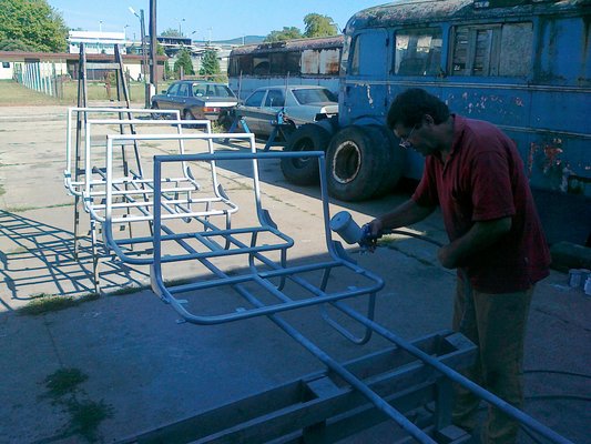 Hagyjuk is a mechanikát, hiszen ha valaki mozog ikarusos-csepeles körökben, annak ezekhez még viszonylag könnyű hozzájutnia. Ám a belső tér... Apróhirdetésből sikerült beszerezni négy darab dupla ülést, azok szolgáltak mintaként a többihez – nem túlzás, hogy egy bizonyos tatai placcon utána egy darabig rendes ülésgyár működött.