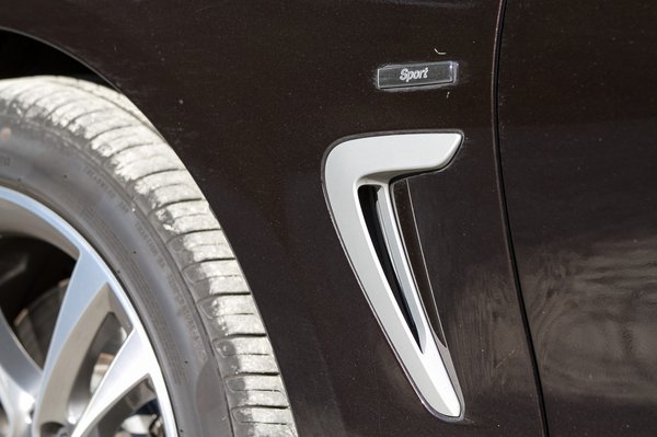 Az első kerék mögött a bumeráng kicsit sok, de meg lehet szokni; a Sport feliratot fölötte már nehezebb megemészteni. Kapna gyomorrontást a Fassbiertől a bajor, aki kitalálta ezeket a plecsniket az új BMW-k oldalán, Modern, Sport meg még ki tudja milyen bugyuta feliratokkal. A Connected Drive szimbólum a rendszám alatt ezután már csak kicsit fáj.
