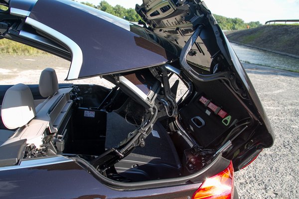 Aztán még egyedül is elbabráltam vele, többször félbeszakítva a műveletet, hogy szemügyre vehessem a mechanikát. Döbbenetes. Jó, hogy egy retikülnél alig nagyobb zseb marad csak a csomagoknak, nem egyszerű egy komplett tetőt behajtogatni a farba. Óvatosnak is kell lenni, egy sörösdobozt simán betömörít a tetőmechanika, ha rossz helyre tesszük. Én egy perc garanciát nem mernék adni rá, a BMW bevállalja a két évet. Elnézve a több tucatnyi karocskát és ami mindezt működteti, nem csodálkoznék, ha ez önmagában száz kilót dobna az autó súlyán. Ha hihetünk a hivatalos számoknak, a kabrió amúgy 230 kilóval nehezebb a kupénál, közel 1,8 tonna.