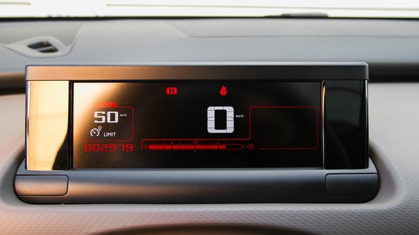 Ha tanulmányautósnak mondjuk a külsőt, a belső még inkább az. Van egy közönséges váltókar, meg egy átlagos, citroënes, bár kétszínű kormány két bajuszkapcsolóval, de minden más elszállt bolondozás. Viszont első tapintásra egyáltalán nem a szétesős fajtából – a minőségérzet mindent egybevetve nem marad el például a Miniétől. Ha már digitális műszerezés, gondolták, legyen tényleg az, és a kormány mögé betámasztottak egy szegmenses, de gagyinak egyáltalán nem mondható kijelzőt. Mókás tipográfiával jelzi a lényeges infókat: sebesség és üzemanyagszint középen, tempomat, illetve limiter beállítása balra, váltásjelző jobbra. Hőmérő, fordulatszámmérő nincs.