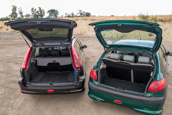 A Kő-Szi Autókernél éppen két 206-os is kellette magát, egy fapados, 1,1-es, 2003-as ötajtós, valamint egy alig százezret futott, jól felszerelt, 2006-os kombi. Tökéletes párosítás. A zöld ferdehátúnak láthatóan mostoha élete volt, küzdelmes 176 ezret futhatott, ha igazat mond az óra. A fekete sokkal frissebb, szinte újszerű, csak a far okozta látványt nehéz feldolgozni. Szebb nem lett a 206 SW az elmúlt években, legfeljebb megszoktuk.