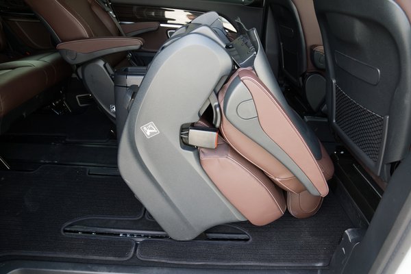 Akik hátul ültek, rögtön a két ülés közé rakott kisasztallal kezdtek kísérletezni. Gyorsan kiderült, hogy nem igazán használható, ha a első sor előre néz. Bár az ülések nem forgathatók a klasszikus értelemben, a sínekből kiemelve fordítva is be lehet tenni, így már mindjárt elfér az asztalka. A Mercedes azt állítja, ez így biztonságosabb. Csak hát ehhez ki kell szállni, kiemelni a nem könnyű üléseket, szóval én mégis inkább a körbeforgósra szavaznék. Egyébként az ülésrendszer nagyon jól használható, mert nemcsak síneken csúsztathatjuk gyakorlatilag bárhová, de ráadásul ha sok a motyó, mindegyik felhajtható, így ki se kell szedni őket.