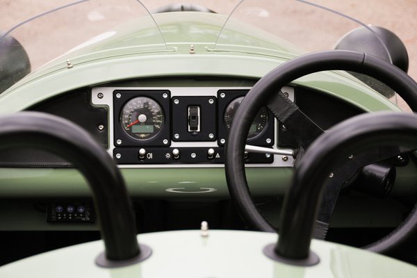 Tehát ott ülünk a kétszemélyes, ajtó, tető és szélvédő nélküli autókában, aminek elöl kettős keresztlengőkaros futóműve, küllős motorbiciklikereke és tárcsaféke van, még előrébb lég-olajhűtésű motorkerékpárokba is szerelt motorja, belül viszont rendes váltókarja, három pedálja, műszerfala, meg kézifékje. Na jó, kiegyezek az autó megnevezéssel.
