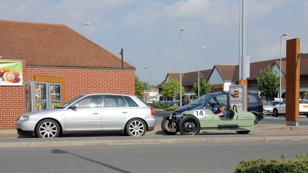 Ez nem sokkal azután történt, hogy a mekiben megálltunk ebédelni, közepesnél nagyobb feltűnést keltve ezzel a poraiból újraálmodott háromkerekű őscsodával, a Morgan Three Wheelerrel. Ebéd közben a pattogva hűlő kipufogó is egyre kevesebb égett műanyagszagot árasztott. Persze a drive-ba hajtva tolatni kellett egyet a sarkon, mert a fordulóköre megegyezik a HMS Queen Elizabeth hadihajóéval. De hogy mennyire életidegen ez a cucc 2014 nyarán, semmi sem mutatja jobban, mint az alábbi fénykép.