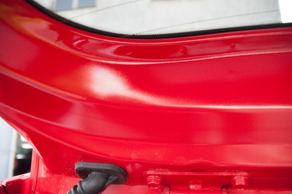 A piros tető fényezett, nem matrica, viszont a fényezés minősége hagy némi kívánnivalót maga után. A piros-fehér átmenet ujjbeggyel is jól kitapintható. Agyaltunk rajta, hogy ez most mi, de a csomagtartó belsejének aeroszolos pirosa végül meggyőzött minket.