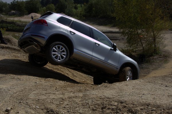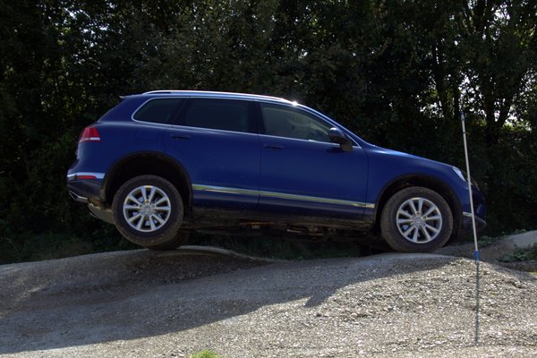A Terrain Tech-csomagból kidobták az amúgy remek Torsent, helyette van két – akár száz százalékosan is zárható – differenciálmű középen és hátul, plusz egy felező, ami inkább harmadoló valójában. Ez a légrugókkal kombinálva már tisztességes hasmagasságot- és átlózó képességet eredményez. Bár ilyenkor érdemes megjegyezni, hogy legmagasabb állásban annyira kirúgja magát a futómű, hogy paradox módon sok esetben kevésbé alkalmas terepjáráshoz, mint az eggyel lejjebb eresztett állás. Lábujjhegyen ugyanis az ember sem tud ugrást csillapítani és a Touareg sem. Ha pedig elpattog, akkor erő ide-difizár oda: tapadást veszít. Szóval hosszú, kavicsos kaptatóra jobb egy kicsit lejjebb engedni. És venni rá tisztességes haspáncélt, mert az nincs. Ezzel – és egy snorkellel – aztán szinte bárhol elmegy.