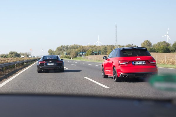 Amire készülünk, úgy hívják, csoportos teszt. Az Audi elénk szórja sportautói csúcsát: négyféle RS-t, és az R8-at. Lényegében mindent, amiknek annyira kicsi a piaca nálunk, hogy nincs értelme külön bemutatni. Az útvonalban sok autópálya, egy kevés vezetéstechnika, majd kietlen főutak, és még több autópálya. A tesztautókon német rendszám, kivéve az R8-at, az nem az Ingolstadtból két hétre idetelepült RS-flottával jött.