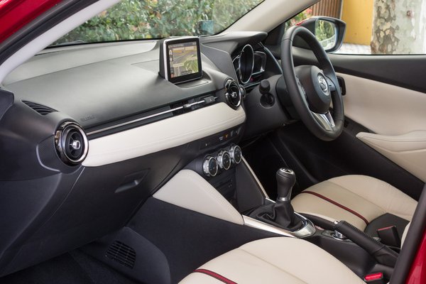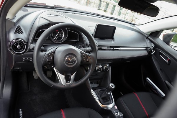Mintha azért lennének áthallások. Például ott az új Passat, amelynek az utas oldali műszerfal-grafikája nagyon hasonló (sima, nagy felület, teljes szélességben futó krómcsík, minden zavarosabb funkció a vezető elé csoportosítva), illetve az Audi A3-nak nagyon ilyen, kör alakú, fém szélű, tekeréssel elzárható szellőzőrostélyai vannak, illetve négyzetméterre mért minimalizmusa –, de a Mazda 2 igazából így is egyedi.