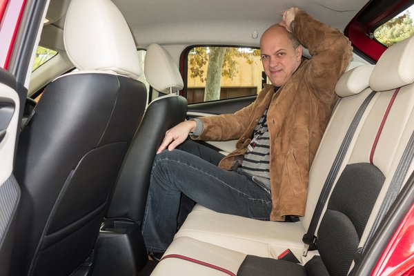 Hátul nem valami tágas a hely, a fejem még csak-csak, de a lábam már csak nagyon kényelmetlenül fér el, igaz, legalább használható csomagtartó van így a kocsi farában. Ja, és a kapaszkodók itt is hiányoznak hátul a tetőből – a kocsi várható árának ismeretében hadd fájjon már az ilyen piti spórolás.