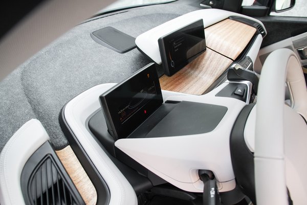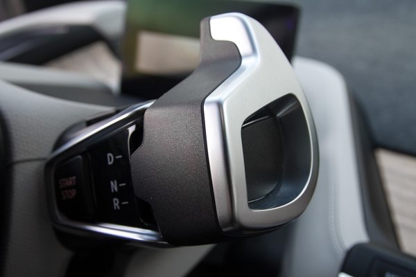 Akármilyen béna a kétküllős, intarziás kormány, engem már nem érdekel. Ezt a furcsa bumszlit akarom forgatni, ami tulajdonképpen az irányváltó a kormány mellett, ezeket a szokatlan papírmasé-formákat akarom simogatni, és a durva textúrájú, természetesnek látszó bőrhöz akarok dörgölőzni. Annyira jó, hogy végre valaki elég bátor volt, és egy konvenciókkal szakító autót konvenciókkal szakító kabinnal áldott meg. Bocs, Tesla, az i3 mellett a Model S csak egy érintőképernyő-függőknek tetszeni akaró átlagos vacak.