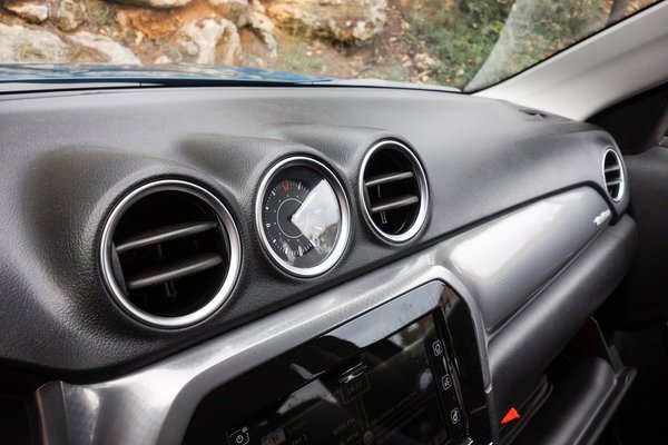 Egy hátul kissé szűk, amúgy tökéletes autóbelsőről van szó tehát? Dehogyis, nem lenne Suzuki-származék a Vitara, ha így lenne. Mert jó ugyan a Fiat 500-ról koppintott ötlet, konkrétan a karosszéria színére fényezett műszerfalbetét, de azokban a verziókban, amelyekben mégsem színkódos ez az elem, sajnos nem hagyták ki a selyemfényű krómnak látszani akaró, gyanús plasztikbetét felnyalásának ziccerét. Inkább maradt volna feketén, ha már egyszer nem színes, nézzék csak az olaszokat, a Fiat 500X-ben például úgy tettek, és az mennyivel igényesebb.