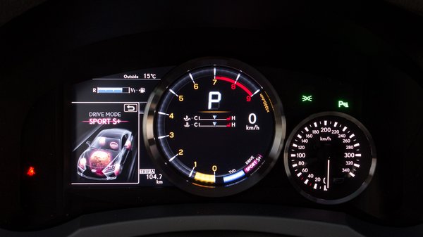 Aztán ha kell, kontinenseket lehet vele átszelni angyali nyugalomban. Erre van az Eco üzemmód, amikor megint vált a fordulatszámmérő, s itt a pillanatnyi üzemanyag-fogyasztás függvényében a mutató helyett csitító csík szín kéklik körben, azt kell figyelni. Ha a V8-as folyamatos fordulaton üzemel (ezt amúgy minden üzemmódban tudja), ugyanolyan Atkinson-ciklusban üzemel, mint a Prius motorja, hosszú szelepnyitásokkal, szerény fogyasztással.