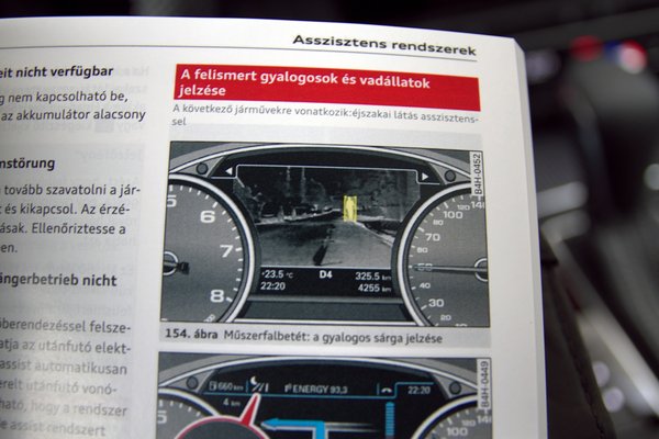 Megkapja a maga sárga keretét akkor is, ha motoron vagy bringán ül és persze gondol a kisgyerekekre is, akiket netán eltakar az autó orra. Őket ordítóan piros keretbe rakja és pittyen is egyet, nem létezik, hogy ne vegyük észre. Ráadásul ilyenkor a szélvédőre vetített kijelzőn is megjelenik egy piros felkiáltójel. Mert persze az is van, gond nélkül megjeleníti egyszerre a navigáció ikonjai mellett a sebességet is. Nappali fényben is működik, ilyenkor azonban nem keretez, hiszen látjuk mi magunk is az alakokat, amint azonban besötétedik, azonnal átvált. Érzékenysége remek (remek hőkép-analízist lehet készíteni az elsuhanó családi házakról), a látószöge vízszintesen és függőlegesen is jókora, és 100 százalékos biztonsággal dolgozik.
