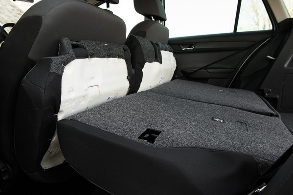 A Fabia Combi gyenge pontja a hátsó ülés, az viszont egy nagyon gyenge pont, minden értelemben. Amikor felvennénk a kombi üzemmódot, és ledöntjük a hátsó támlát, észbe kapunk, hogy az ülőlapot is előre kéne billenteni. Visszadöntjük a támlát és fogást keresünk az ülőlapon, rángatjuk ide-oda, és egyszerre csak feljön, de úgy, hogy meg is ijed az ember: igazából nem billenthető, és az csak egy dolog, hogy én most lebillentettem. Gyorsan ellenőrzöm is, hogyan lehet visszapattintani a helyére, és hát ahogy az övcsatoknál nyeklik az anyag, nem egészen egyértelmű. Még kevésbé az, amikor találkozunk az üléskárpit vad határvidékével, az alapállapotban nem látható felülettel, ahol a civilizáció véget és, és indián lovasok támadják a vasútépítőket a végtelen hungarocell prériken. Az pedig végképp természetes, hogy a ledöntött támla, és az egész hátsó rakodóhely még így sem lesz vízszintes. Kösz, Orbán.