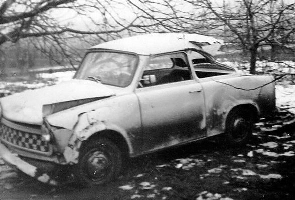 Régi fényképek nézegetése során bukkantam a trabantos képekre, amelyek történetét édesapám osztotta meg velem idestova 37 év után. 1973 nyarán szerzett jogosítványt, és az akkor 19 éves nőtlen fiatalember, mint sokan a vele egykorú ifjoncok, fiatal korukból és anyagi okokból adódóan nem tudtak autót vásárolni. Apám viszont abban a szerencsés helyzetben volt, hogy több alkalommal kölcsönkérhette nagybátyjától páréves Trabantját. Elmondása szerint 1974 telén Nyíregyháza és Nagykálló között a jeges úton megcsúsztak, majd az autó tetején átfordulva az árokban landolt. Szerencsére sem édesapámnak, sem barátjának nem történt baja, ellentétben a Trabanttal amely bizony rendesen megrogyott. Az eset után apám jó pár hónapig törlesztette a Trabant javítási költségeit a tulajdonosnak.