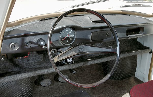 A kocsi különlegessége, hogy átmeneti változat, már a kör alakú műszerrel szerelték, de még szürkék a gumikéderek és a díszlécekben lévő gumicsíkok is. Bordó ülések a 601 S-ek közül csak az első szériában gyártottakba kerültek. Hogy más a lökhárító íve, és az alsó felén is teljesen behajlik, illetve más formájú a köténylemez, már csak avatott szemnek tűnik fel. S hogy az első indexburák íve is eltér, szinte alig észrevehető.