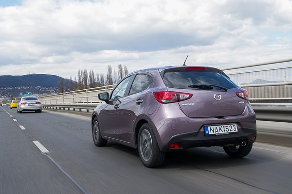 Csatolt lengőkar hátul, MacPherson elöl, ez az olcsó kisautó-futómű recept már évek óta. Nem okvetlenül jelent rosszat, és a Mazda ügyesen is nyúlt hozzá, hiszen kellően feszes lett, de nem rázza ki az ember zsebéből az aprópénzt. Sorozatos és hirtelen terhelésváltáskor ugyan a hátulja kissé kiesik a szinkronból, és elhagyja magát, de gond nélkül kézben tartható a pontos kormánnyal, bár utóbbi a végállásai körül furán elnehezedik. A vezetési élményt nagyjából egy lapra helyezném az ezres Ecoboost-Fiestáéval, ami nem kis elismerés, hiszen a kis Fordot már abban a formában is élmény vezetni, és belőle lett a tavaly a legjobb hot-hatch, a Fiesta ST is.