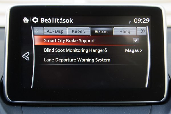 Mivel ez a csúcsmodell, természetesen megkapta az i-Eloop rendszert, amely egy nagykapacitású kondenzátorban tárolja a delejt, de akad Stop/Start is (jó reakcióidővel, okos működéssel), holttérfigyelő, pici kis tükörre vetített Head-Up Display, sávtartó és parkradar. Utóbbi jó és kötelező is, de egy kamera sokkal jobb lenne, az autó sarkait ugyanis még a rutinos sofőrnek is nagyon szokni kell. Ja, és persze ledes fényszóró, amiről nem tudok nyilatkozni, mert éjjel sosem mentem vele sehová.